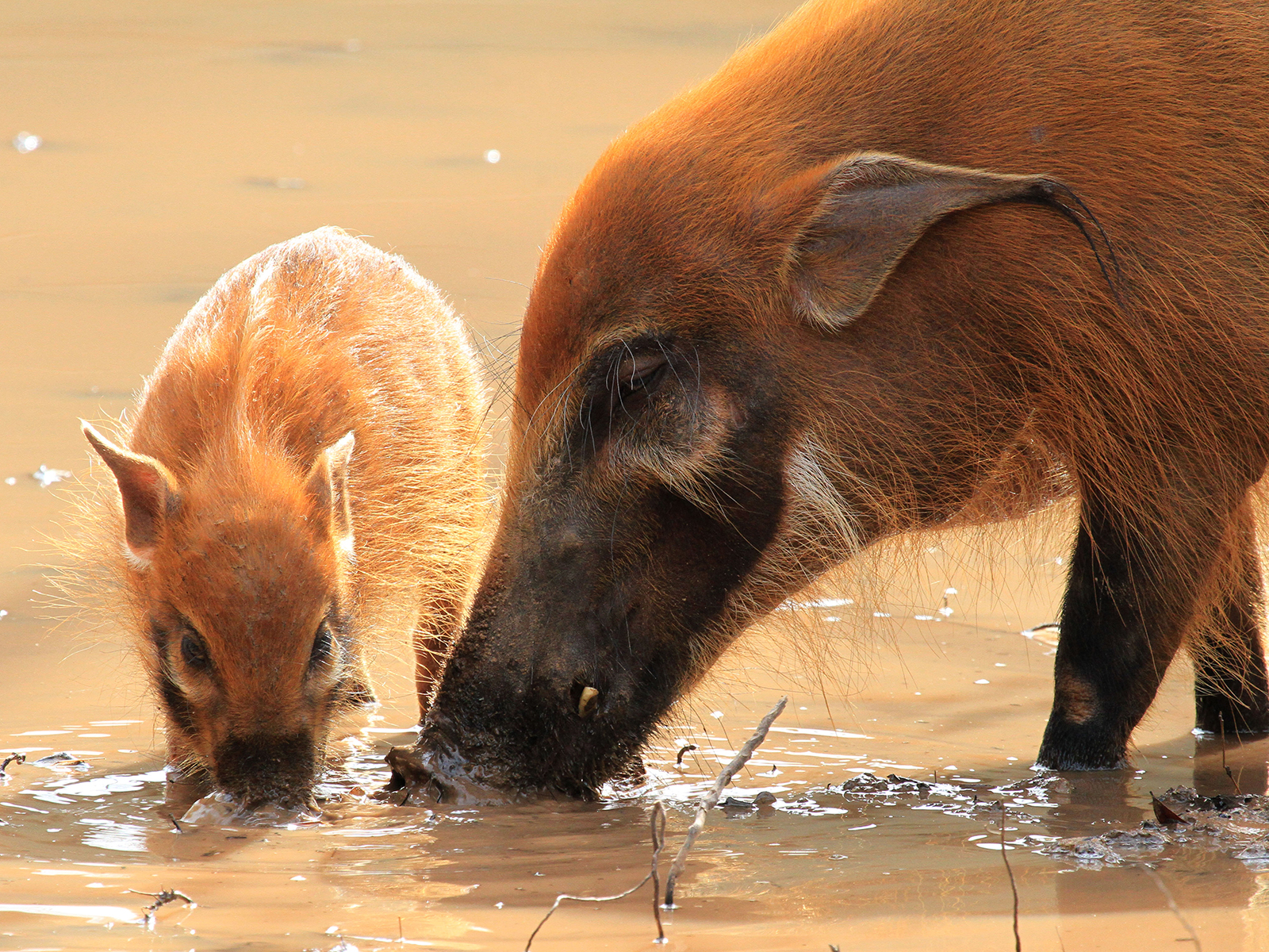 Red river hogs are named for their reddish brown fur and the fact that they often wade through water.